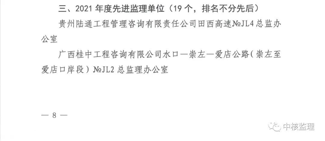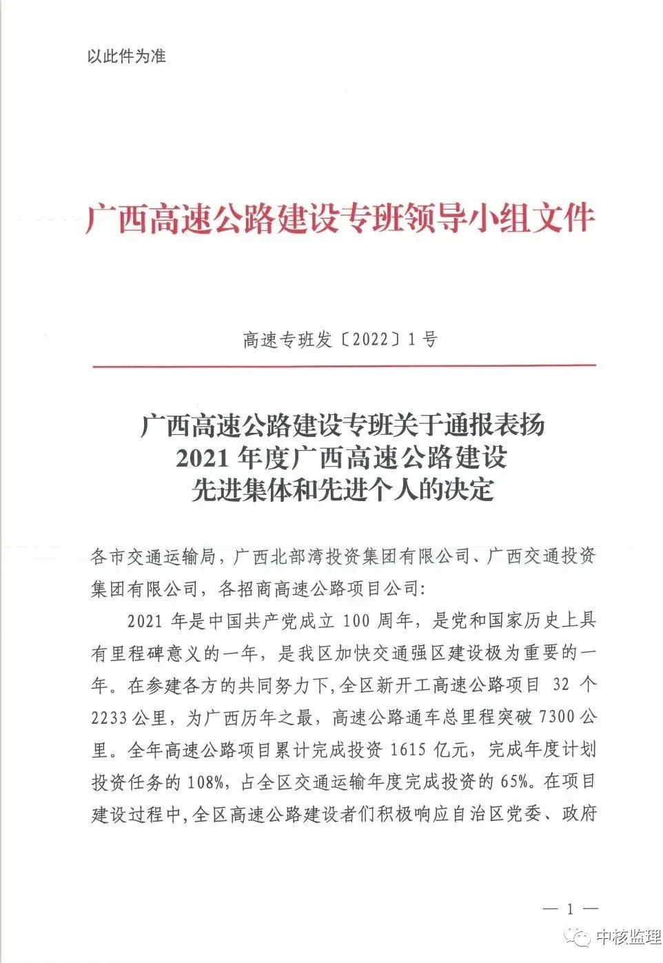 2021年是公司“五三一”战略的起步的一年,在公司领导的关心、支持下,在项目部的积极配合下中核监理平塘至天峨高速公路№JL4总监办全体监理人员精诚团结、勤苦务实、奋勇争先,基本实现了安全生产、文明施工、质量合格、工期合理、廉洁高效的既定目标,取得了较好的成绩。并获得了广西高速公路建设专办“2021年度先进监理单位”。