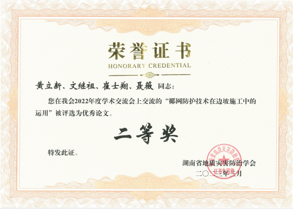 下午,湖南省地质灾害防治学会学术交流会顺利举行,各会员单位技术人员和管理人员参加了学术交流会议。会议进行了国家级专家专题学术汇报和优秀论文交流及颁奖等议程。本次学术交流会共征集学术论文51篇,我司作为湖南省地质灾害防治学会地质灾害治理与生态修复工程监理专业委员会主任委员单位,向学术交流会推荐学术论文3篇;学会组织专家对征集的论文进行了集中评选,经资料初审、专家会审、评委会终审,共选出优秀论文10篇,其中一等奖1篇、二等奖3篇、三等奖6篇,我司选送的《椰网防护技术在边坡施工中的运用——以湖南省白南高速为例》荣获优秀论文二等奖。