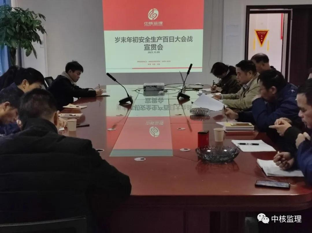 为贯彻落实全省重点交通建设项目 岁末年初安全生产百日大会战 活动, 2021 年 11 月 9 日上午,中核监理醴娄高速公路第一监理处组织全体监理人员召开了 岁末年初安全生产百日大会战 宣贯会。 会上,监理副处长章再福同志指出年底是生产建设的繁忙期,更是安......[查看详情]