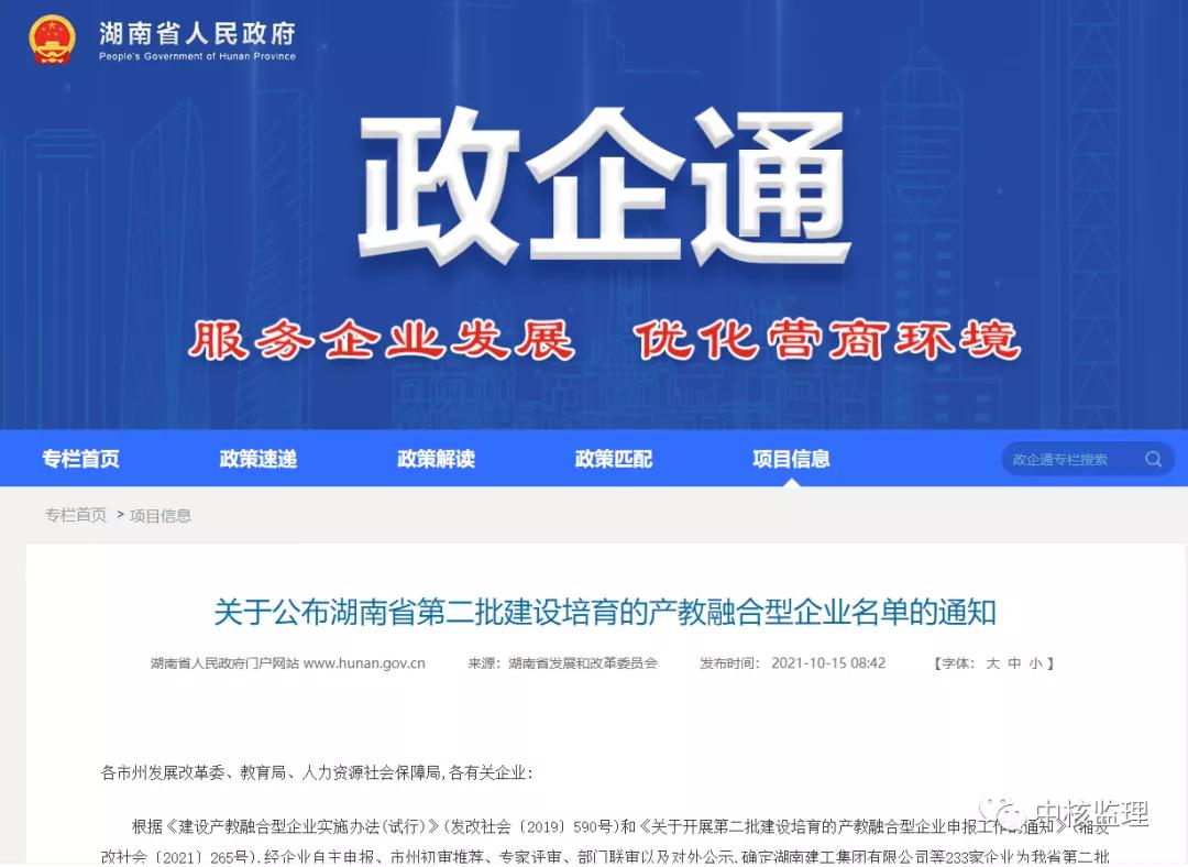 近日,湖南省发展和改革委员会、湖南省教育厅、湖南省人力资源和社会保障厅联合发布文件《关于公布湖南省第二批建设培育的产教融合型企业名单的通知》(湘发改社会〔2021〕792号),公布了湖南省第二批建设培育的产教融合型企业名单,长沙中核工程监理咨询有......[查看详情]