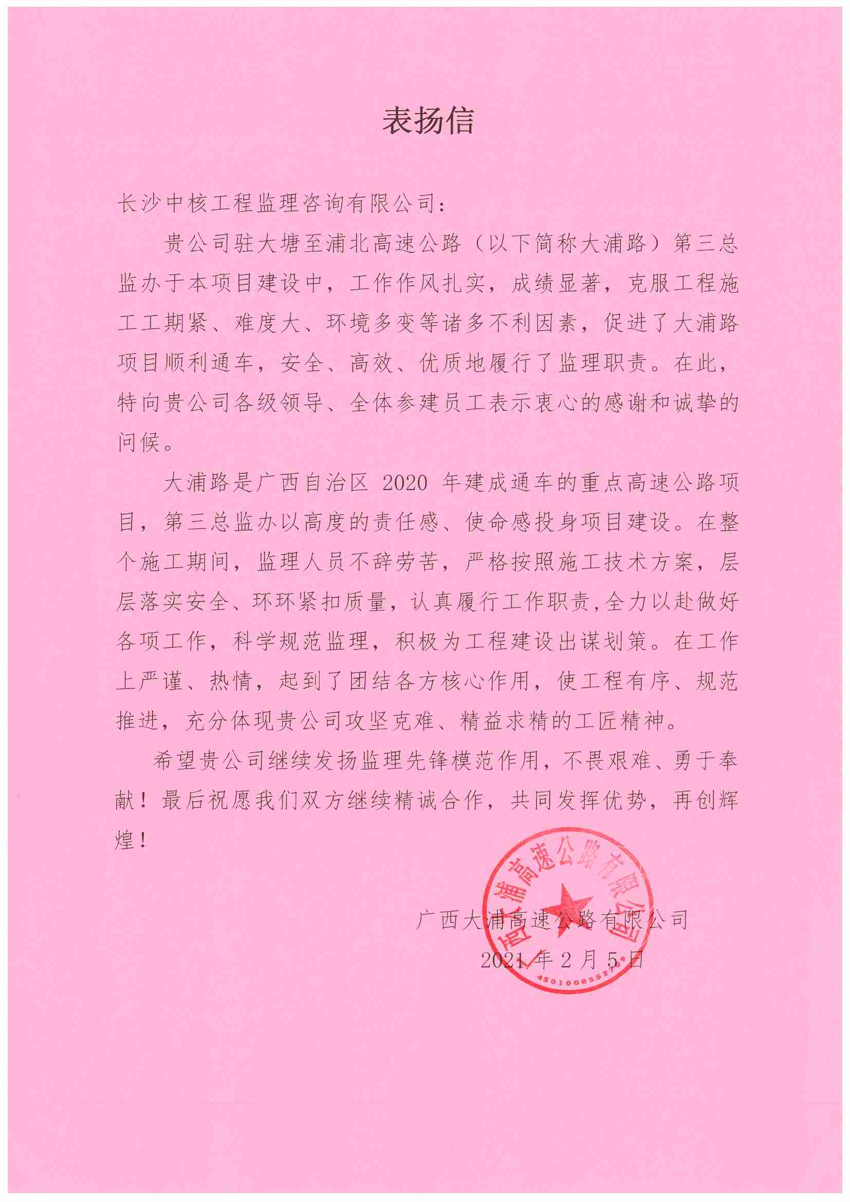 2021 年 2 月 5 日,我司收到广西大浦高速业主发来的表扬信,大浦公司在信中对长沙中核大浦高速第三总监办的各项工作予以充分肯定。对总监办全体监理人员不辞劳苦,以高度的责任感和使命感投身项目建设,克服诸多不利因素促进大浦高速顺利通车,优质高效的履......[查看详情]