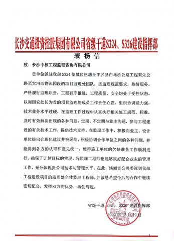 宁乡S324项目收到业主表扬信 近日,我司收到长沙交通投资控股集团有限公司省级干道S324、S326建设指挥部的表扬信,对S324项目监理处在S324望城区格塘至宁乡县白马桥公路工程双朱公路至大河西物流园段工程建设过程中,勇于面对各种困难、科学监理、优质服务、......[查看详情]